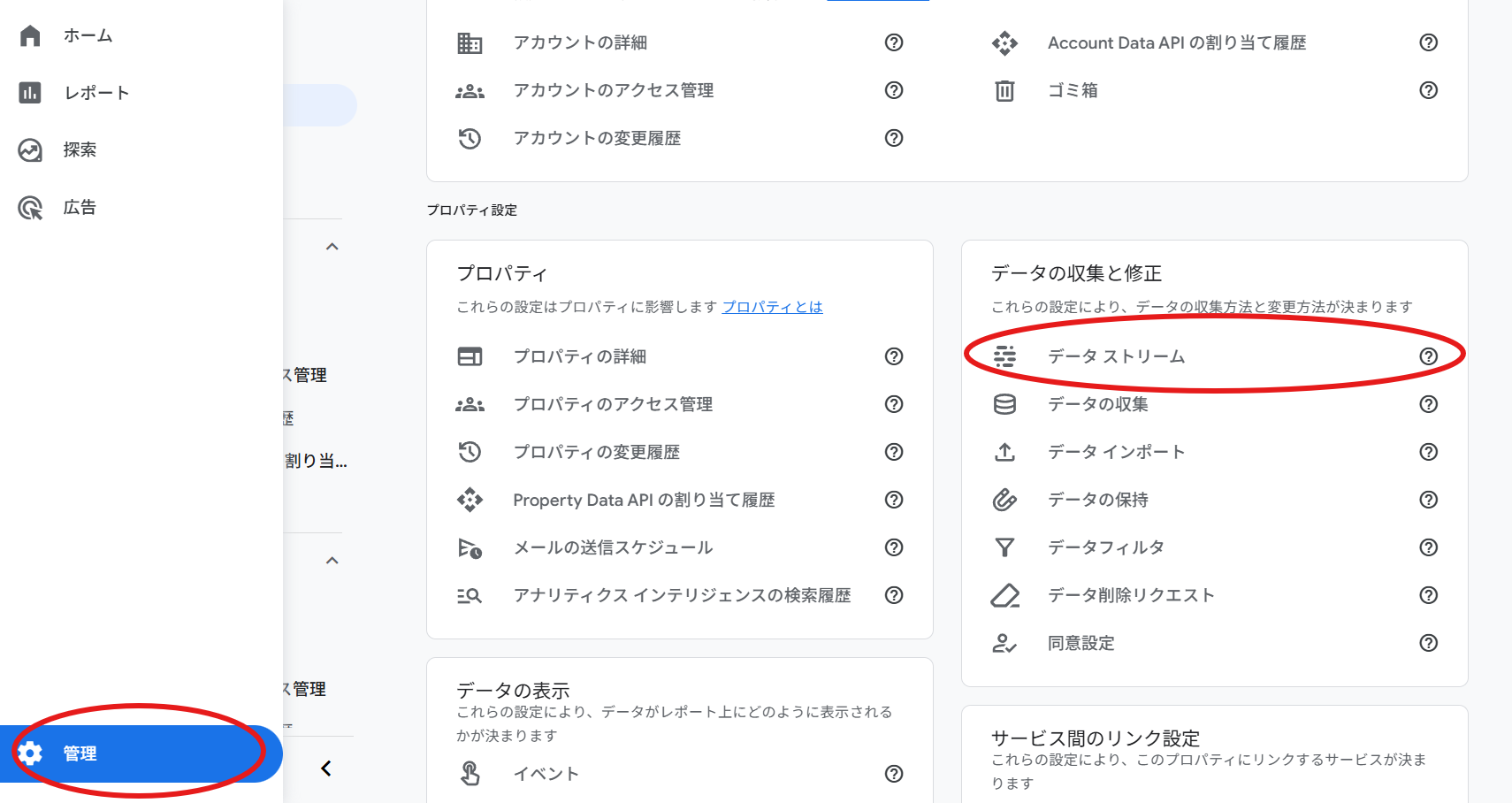 「データの収集と修正」内の「データストリーム」をクリックします。