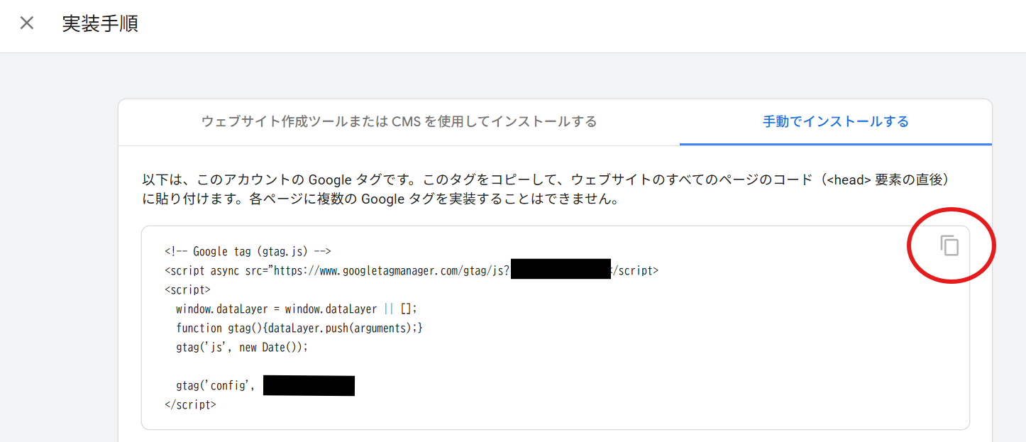 「手動でインストールする」タブ内に表示された、トラッキングコードをコピーします。