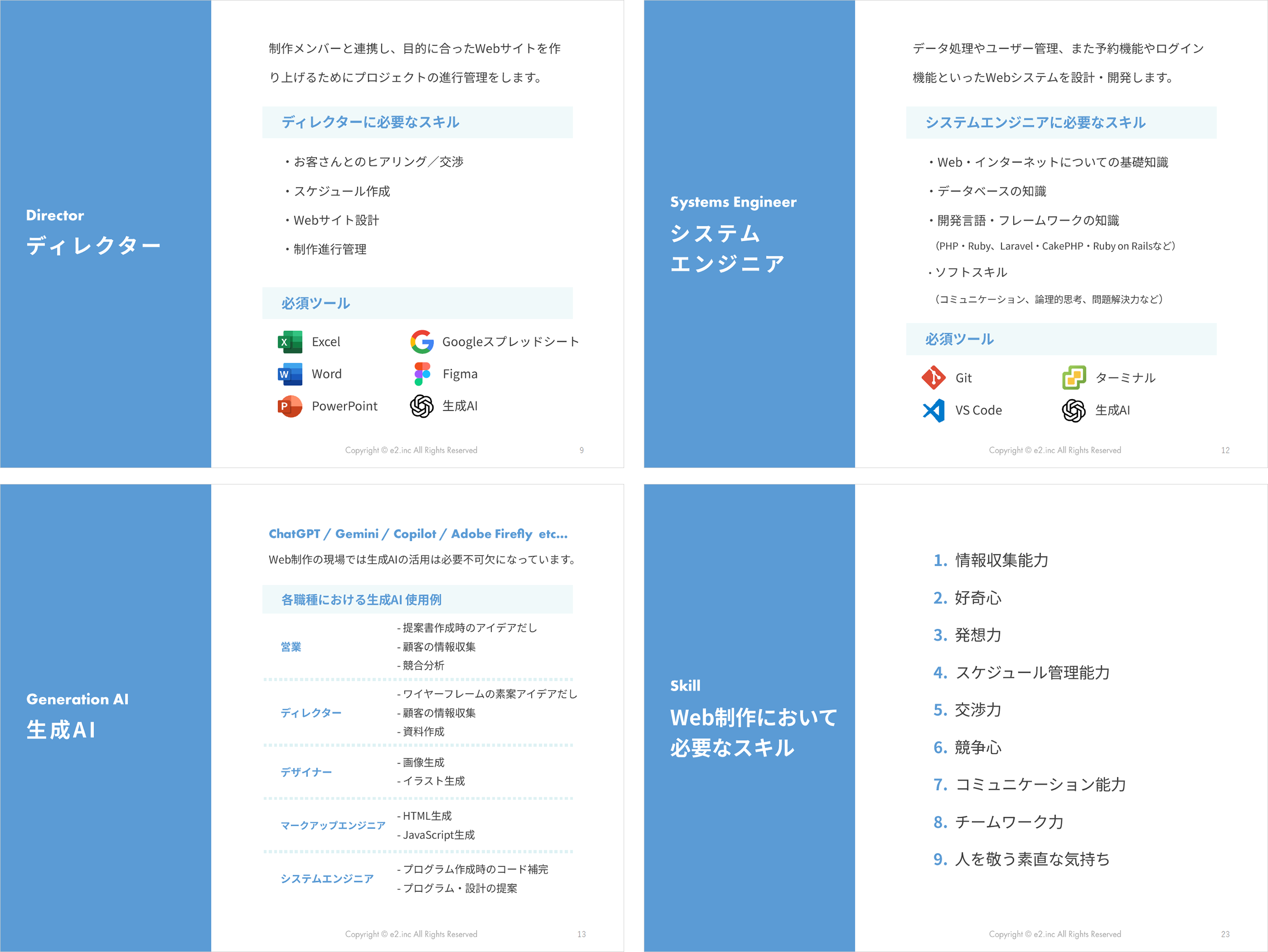 営業、ディレクター、デザイナー、エンジニア、それぞれの役割をくわしく説明するとともに、今やどの職種にも欠かせないものとなった生成AI関連の話も交え、実際の業務の進め方や仕事をするうえで大切にしていることについて、高校生がよりイメージしやすいように表現や内容に気を配りました。